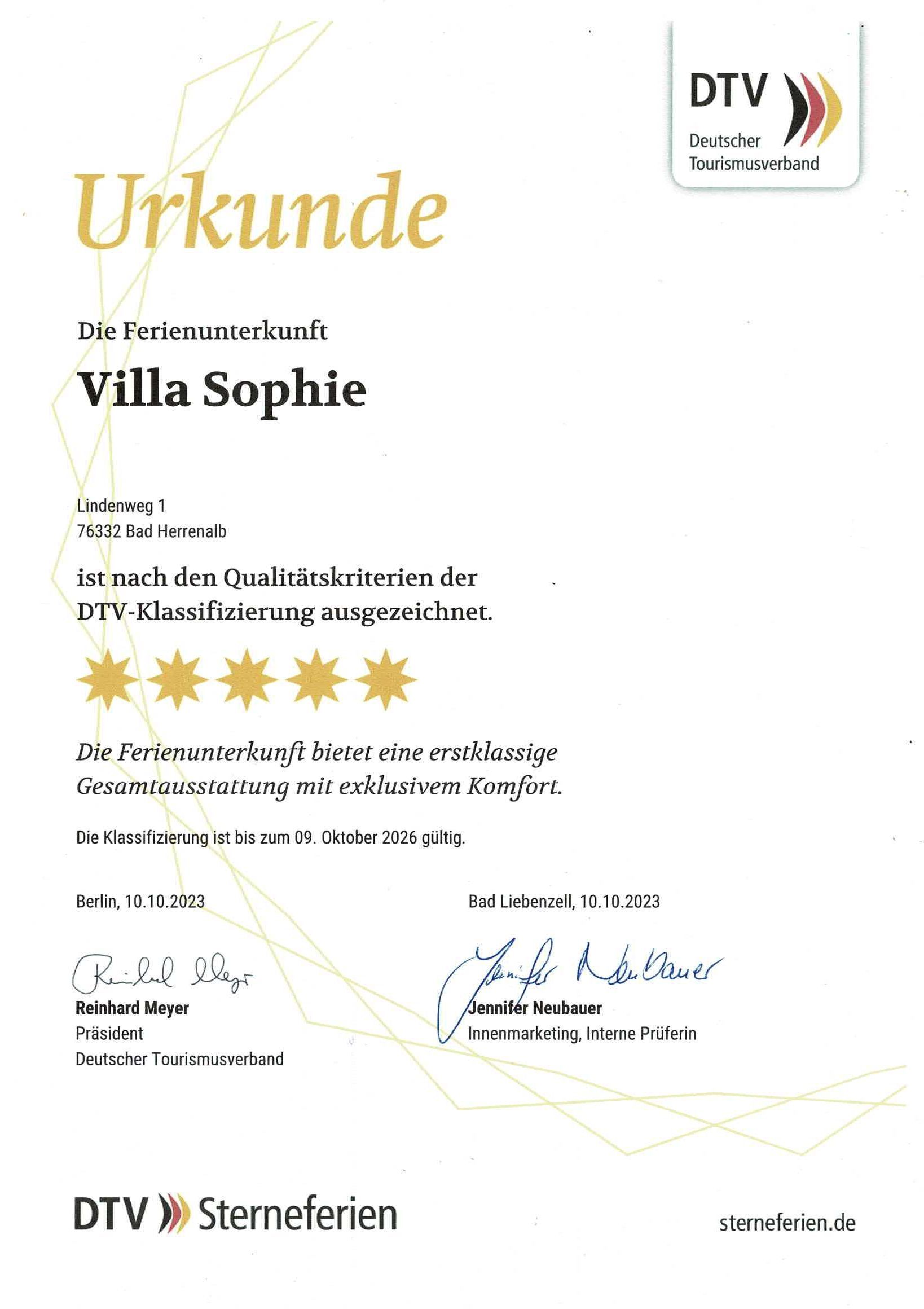Unsere Villa thront direkt am Kurpark von Bad Herrenalb am steilen Hang über dem Flüsschen Alb. Das 1913 erbaute und renovierte Gebäude mit ca. 220m² Wohnraum wird seit 2019 erfolgreich als Ferienhaus vermietet und wurde zuletzt im Oktober 2023 vom Deutschen Tourismusverband erneut als 5-Sterne-Haus zertifiziert.